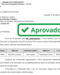 Fazendo jus a suas promesas de campanha, de lutar para conseguir recursos para nosso municipio, o Vereador Gato (PP) conseguiu mais um recurso, vindo de uma emenda parlamentar, do Deputado Federal Ezequiel Fonseca.